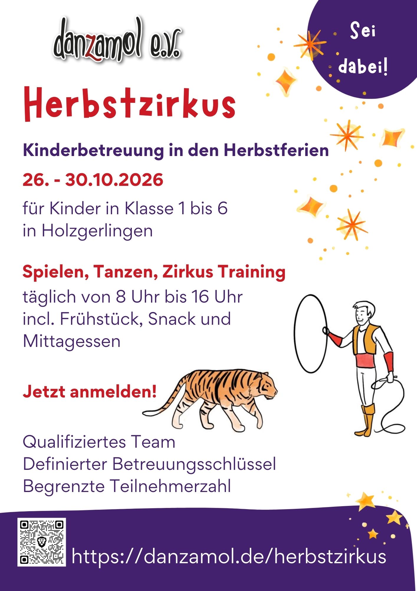 Von Montag, 26.10.2.2026 bis Freitag, 30.10.2026, trainieren Artisten der Klassenstufen 1 bis 6 beim Osterzirkus von danzamol – sei dabei!